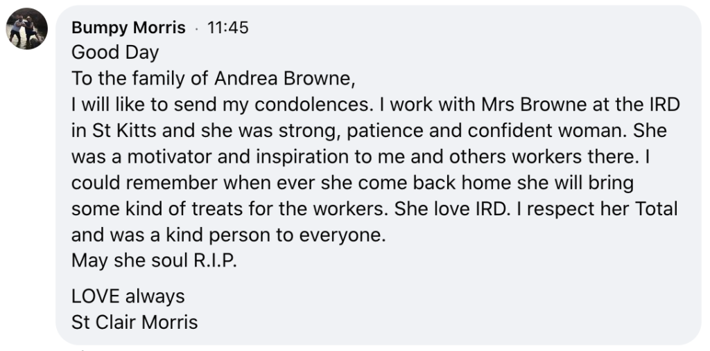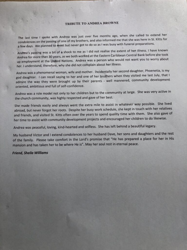 Born in St. Kitts and Nevis, Andrea was a career auditor for the United Nations. Her career fed her love of traveling as she was able to visit numerous countries, extending her family and making friends all over the world. She married Dave Browne in 1987 and enjoyed 35 years of marriage that brought five children into the world. On May 9, 2001, Andrea and Dave immigrated to the United States, briefly living in New York City before settling in Piscataway, New Jersey. As her children grew, she shared with them her love of dominoes, cards and board games. As a former netball and track star she also shared her love of sports, from football (soccer), cricket, and basketball to egg toss, lime & spoon, and hand tennis. But ultimately it was the time she shared with them that mattered most.