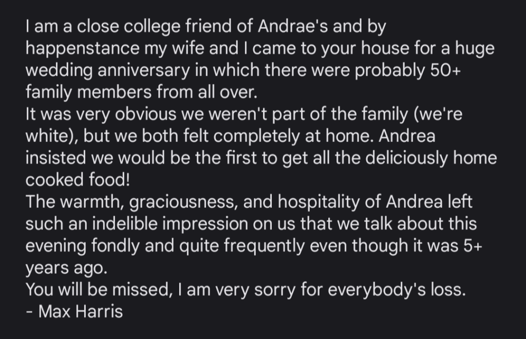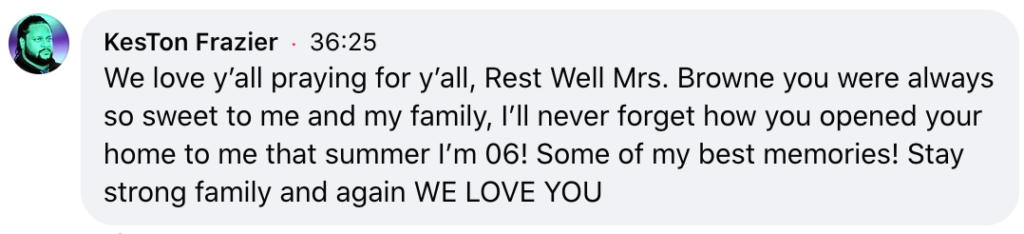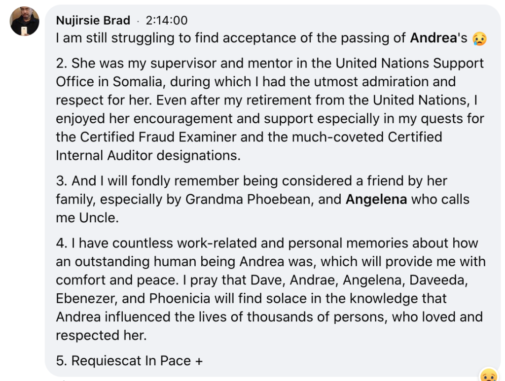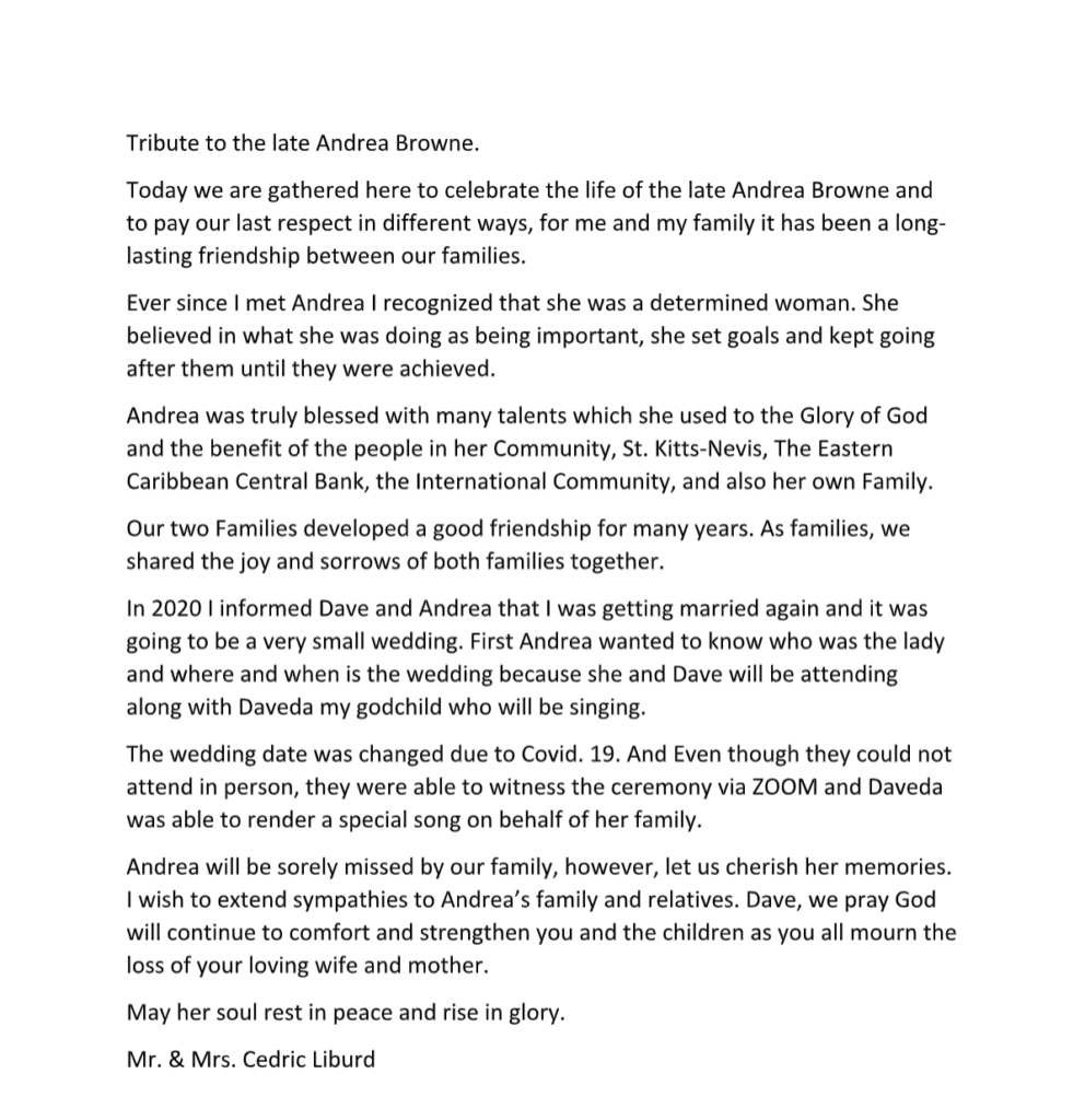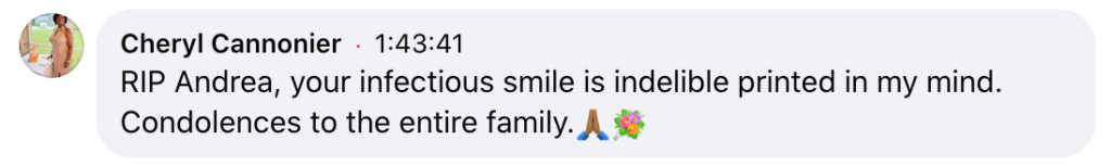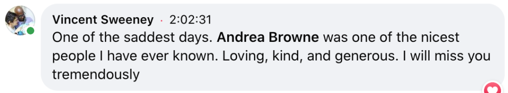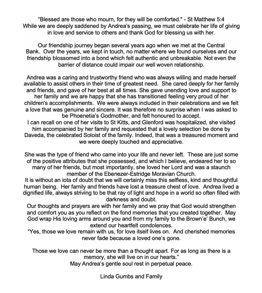 Andrea leaves behind her devoted husband of 35 years Dave Browne, her mother Phoebean Charles, her mother-in-law Gloria Browne, and her cherished five children: Daveda, Andrae, Phoenetia, Ezer, and Angelena Browne.